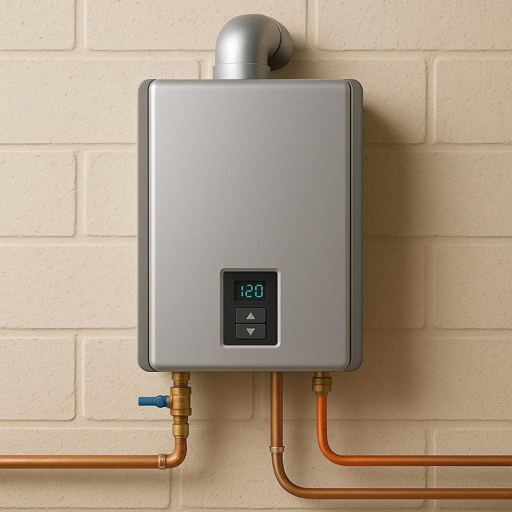 An on-demand tankless water heater (sometimes called an instant hot water heater) is a high-efficiency system that heats water only when you need it, instead of storing hot water in a tank. Unlike traditional storage tank heaters, it doesn’t keep 40–60 gallons of water hot all day, which saves energy and provides endless hot water.